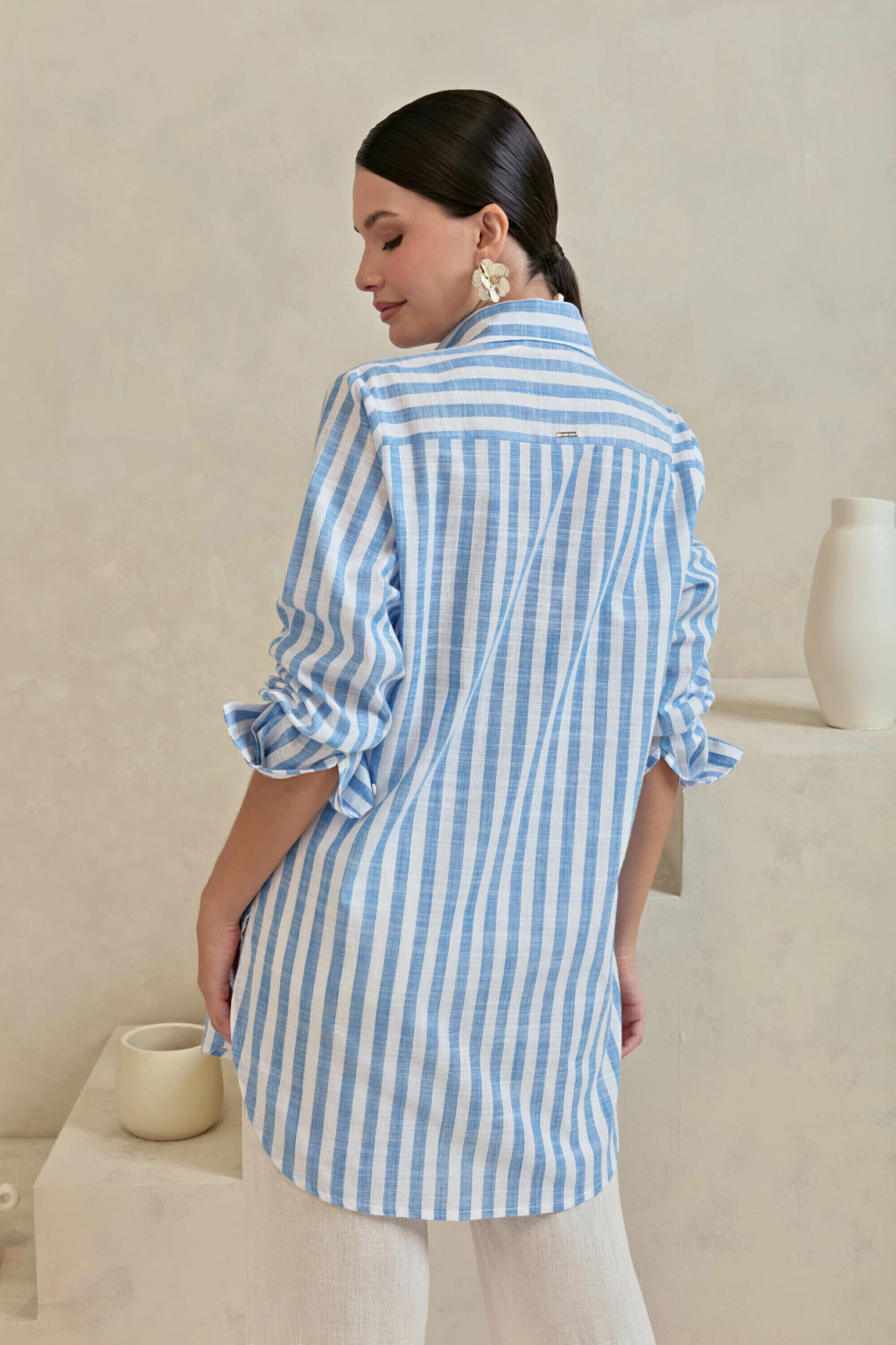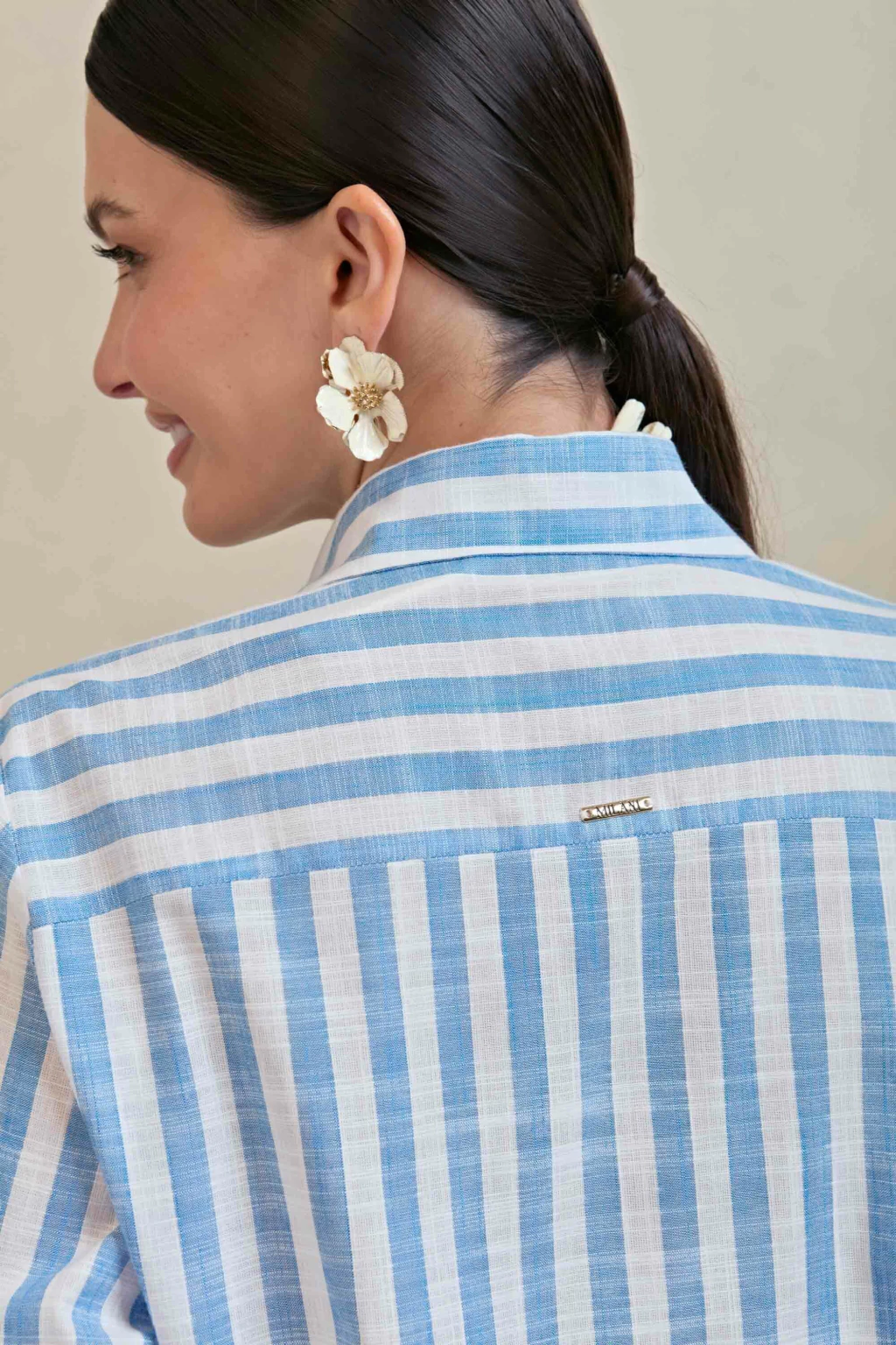 A Camisa Chemise Listrada é a escolha perfeita para quem busca aliar elegância e praticidade com um toque de frescor. Confeccionada em tecido 100% algodão com textura de linho, proporciona leveza ao vestir e é ideal para os dias mais quentes.